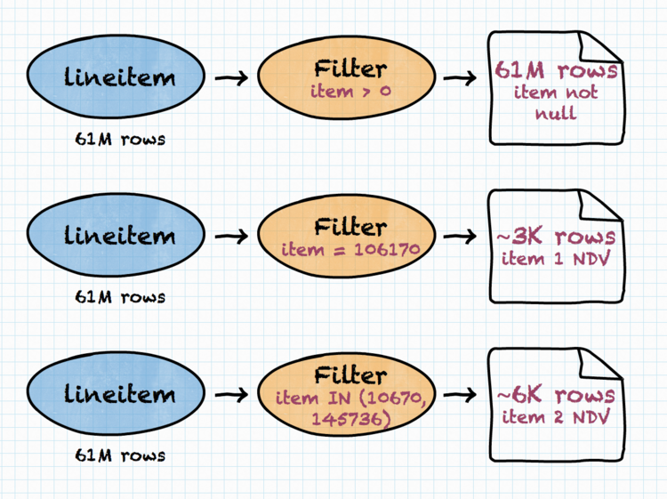 - what is the probability that data row will pass the filtering condition. From this, expected number of rows after the filter is derived,
