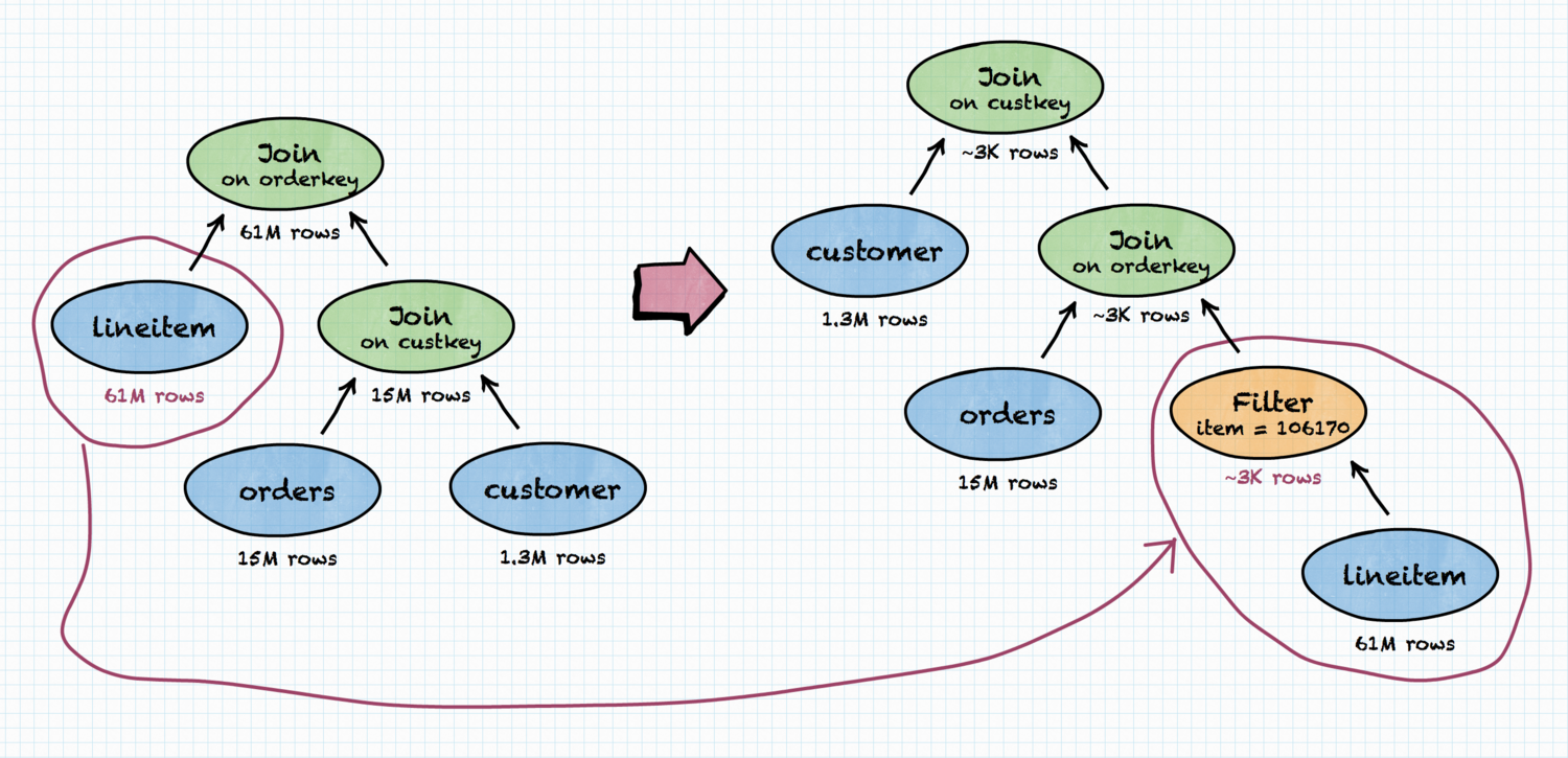The additional FILTER might be applied after the JOIN or before. Obviously, filtering as early as possible is the best strategy, but this also means the actual size of the data involved in the JOIN will be different now. In our Data Scientist’s example, the join order will indeed be different.