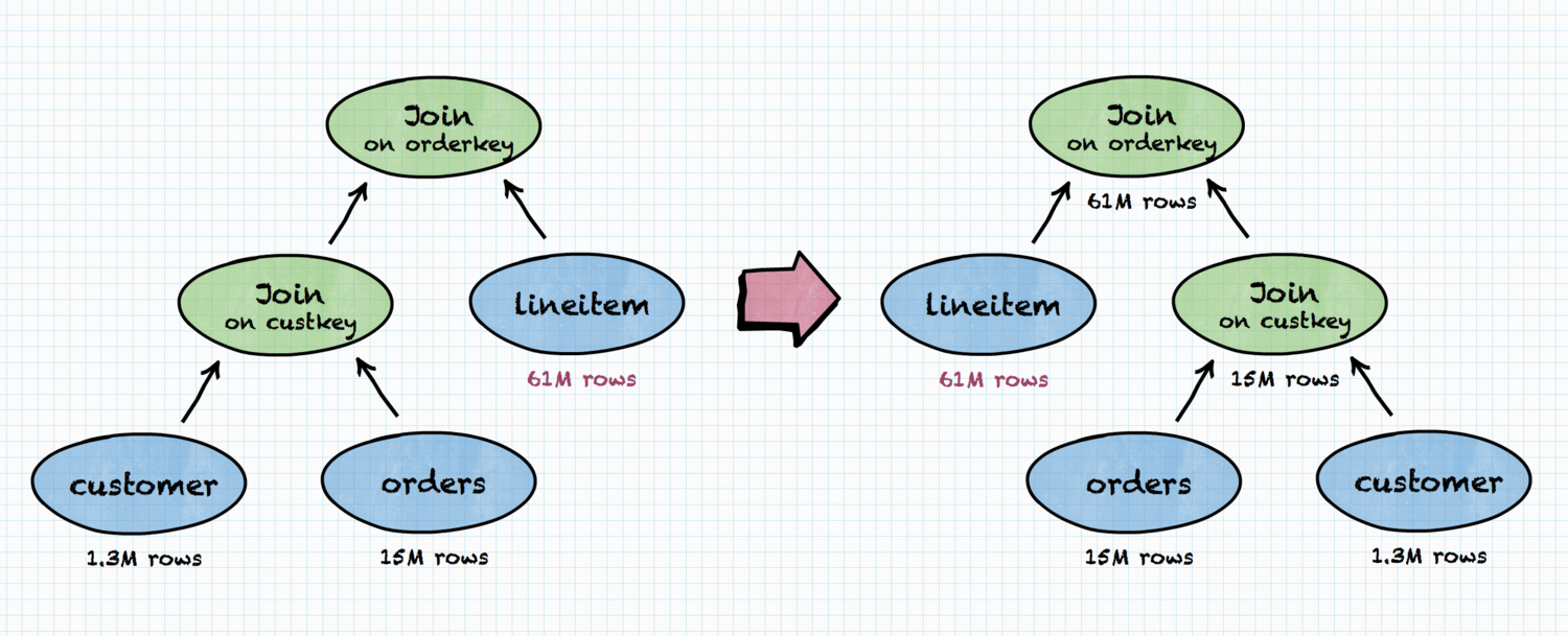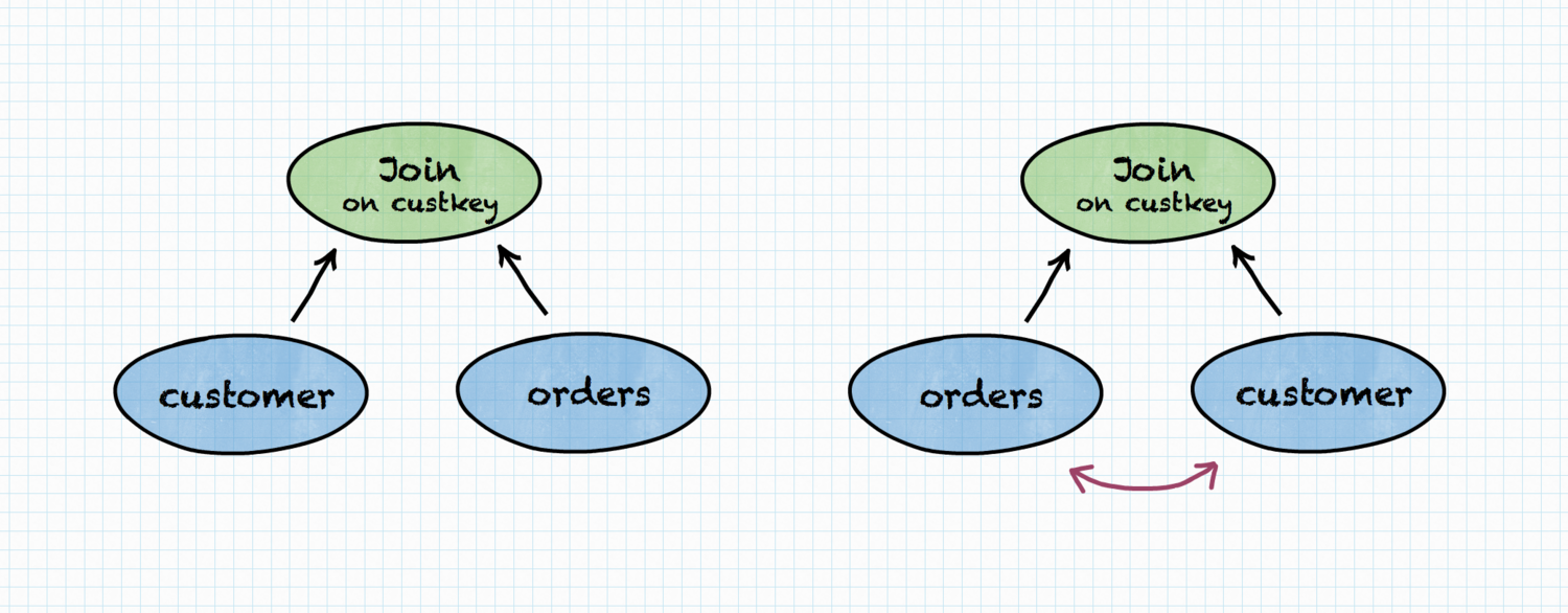 Without going into database internals on how JOIN is implemented, let’s take for granted that it makes a big difference which table is right and which is left in the JOIN. (Simple explanation would be that the table on the right basically needs to be kept in the memory while JOIN result is calculated). Because of that, the following plans produce same result, but may have different execution time or memory requirements.