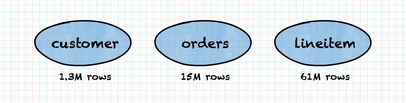 WHERE c.custkey = o.custkey AND l.orderkey = o.orderkey