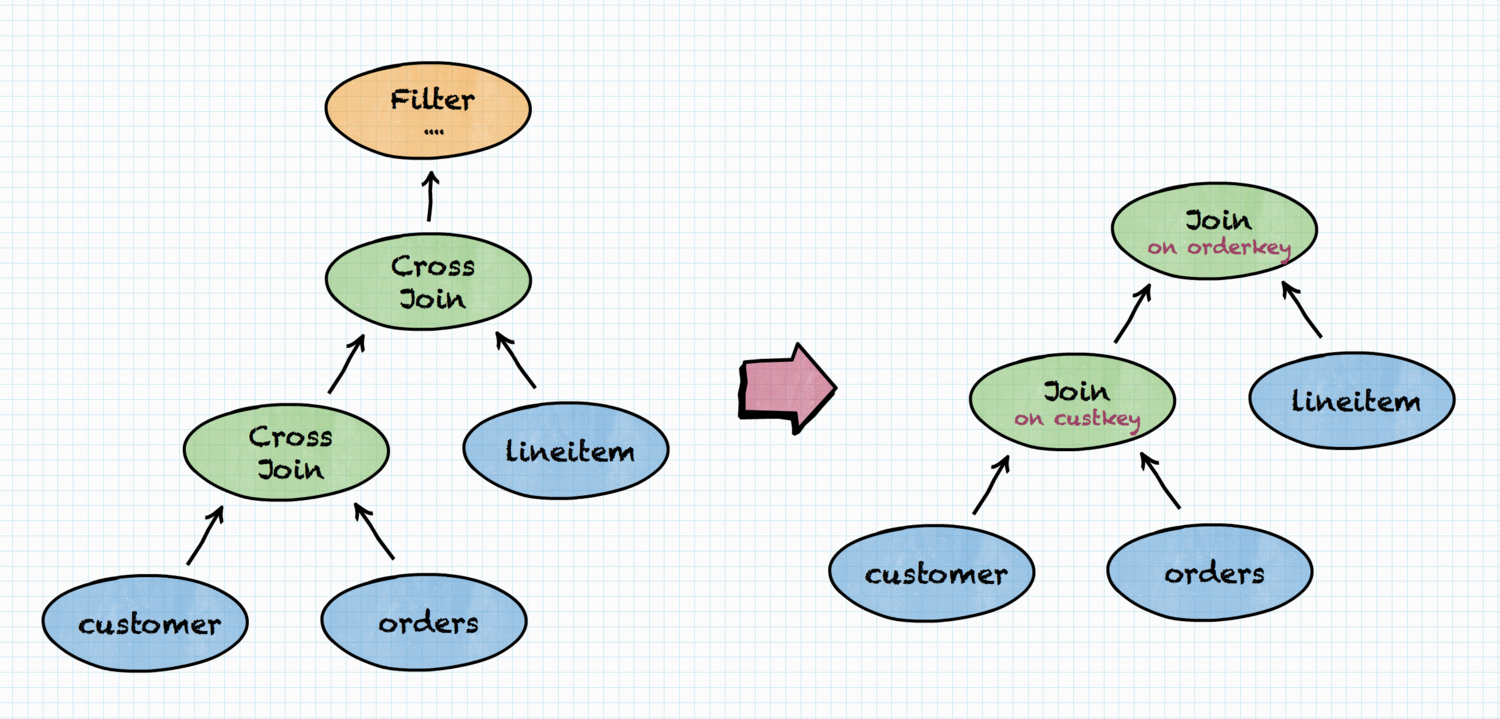 query and FILTER for WHERE c.custkey = o.custkey AND l.orderkey = o.orderkey.