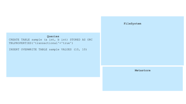 delete_delta_<writeId>_<writeId>under partition/table location. - Delta Directory: This type is created for the results of INSERT statements