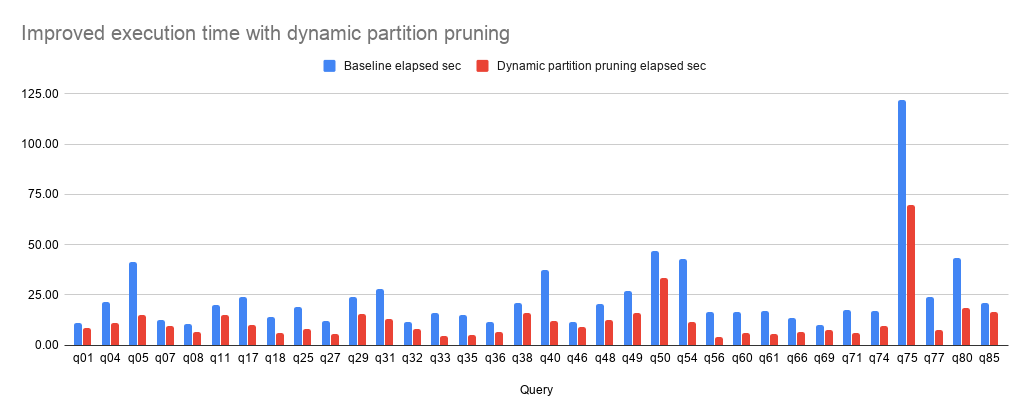| Query | Baseline elapsed | Dynamic partition pruning elapsed | Baseline CPU | Dynamic partition pruning CPU | Baseline data read | Dynamic partition pruning data read |