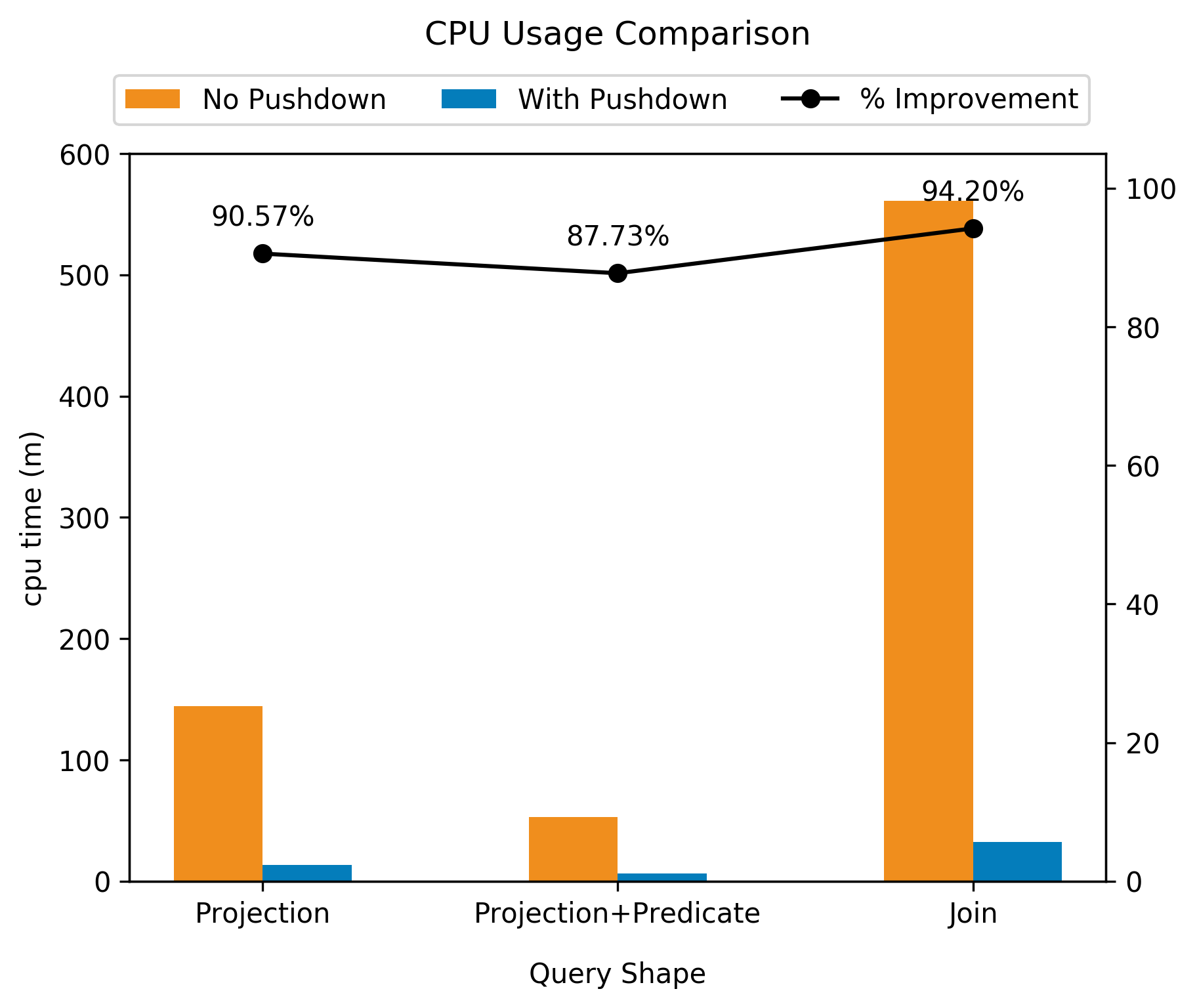 With the dereference pushdown, queries observe significant performance gains in terms of CPU/memory usage and query runtime, roughly proportional to the relative size of nested columns compared to the accessed fields.