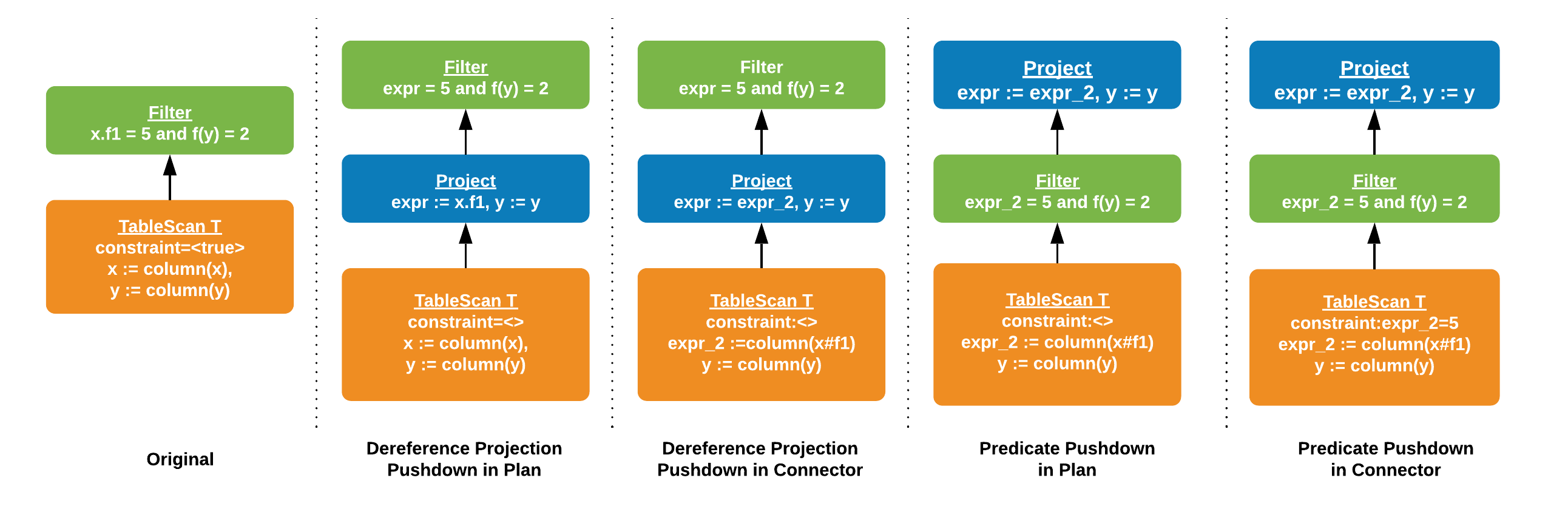 First, dereference projections are extracted in the query plan and pushed as close to the table scan as possible. This happens independent of what the connector is. Secondly, there is a further improvement for Hive tables. The Hive Connector and ORC/Parquet readers have been optimized to scan only the sufficient subfield columns.