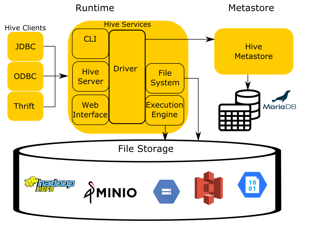 The storage component is simply that, it stores files in various formats and index structures to recall these files. The file formats can be anything as simple as JSON and CSV, to more complex files such as columnar formats like ORC and Parquet. Traditionally, Hive runs on top of the Hadoop Distributed Filesystem (HDFS). As cloud-based options became more prevalent, object storage like Amazon S3, Azure Blob Storage, Google Cloud Storage, and others needed to be leveraged as well and replaced HDFS as the storage component.