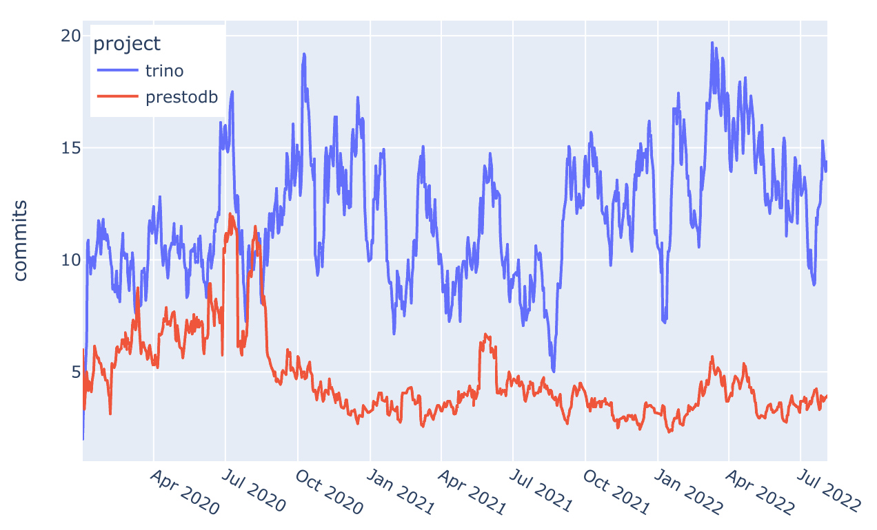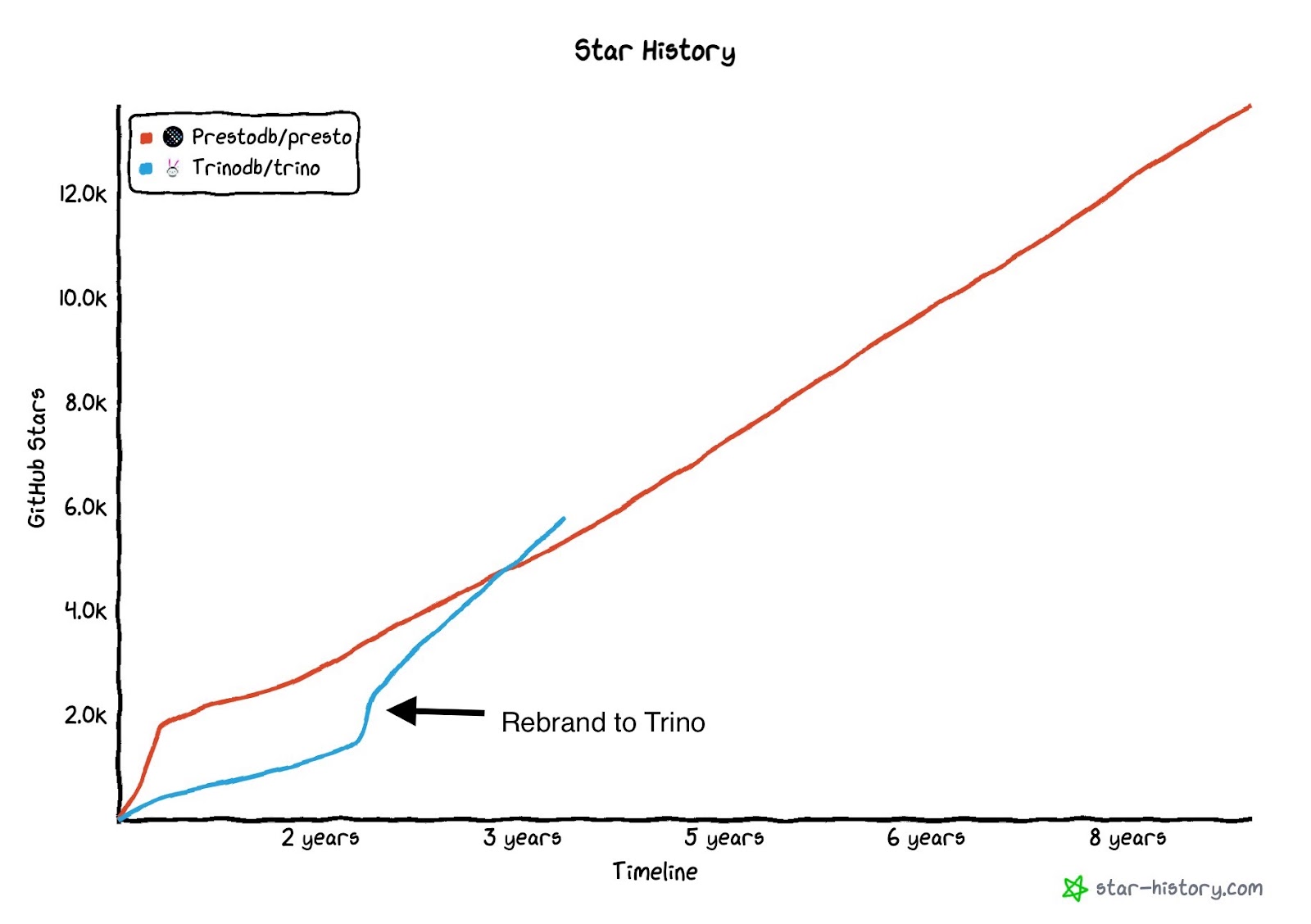 We saw the pattern repeat when we were forced to rebrand and changed the name to Trino. We doubled down again on developing the community, and again participation accelerated. It’s because of this that we believe the Trino community is stronger than ever before.