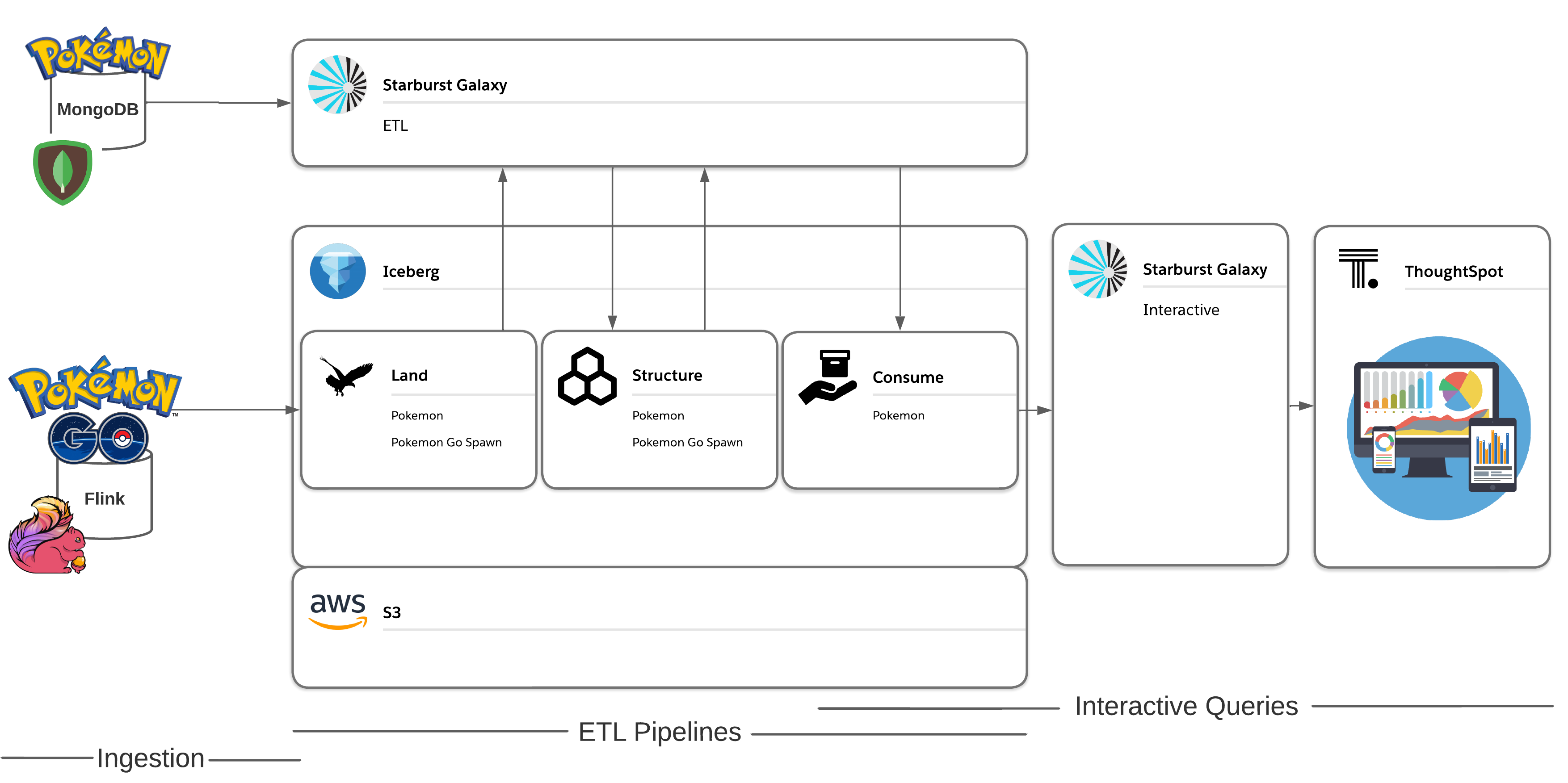 To do this, I build out a reporting structure in the data lake using Starburst Galaxy. The first step is to read the raw data stored in the land layer, then clean and optimize that data into more performant ORC files in the structure layer. Finally, I join the spawn data and Pokédex data together into a single table that is cleaned and ready to be utilized by a data consumer. Next I apply role-based access control capabilities within Starburst Galaxy, which provides the proper data governance so that data consumers only have read permissions to that final table. I then create some visualizations to analyze which Pokémon are common to spawn in the San Francisco area.