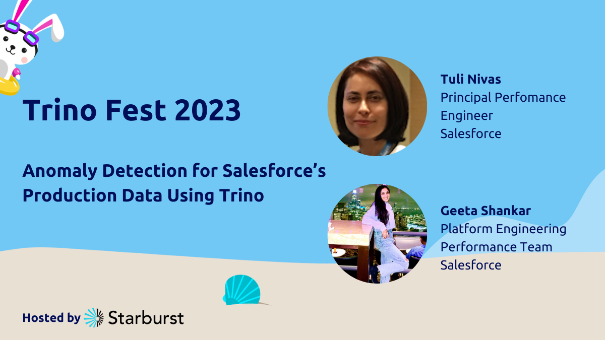 Rolling into our next presentation from Trino Fest 2023, we’re excited to bring you Tuli Navas and Geeta Shankar’s talk from the Performance Engineering Team at Salesforce. They provide numerous reasons for why they need Trino and further explain how it is essential for anomaly detection in their data. It’s an insightful talk about using a query engine to ensure data quality and how switching to Trino has massively improved their performance. You definitely don’t want to miss it.