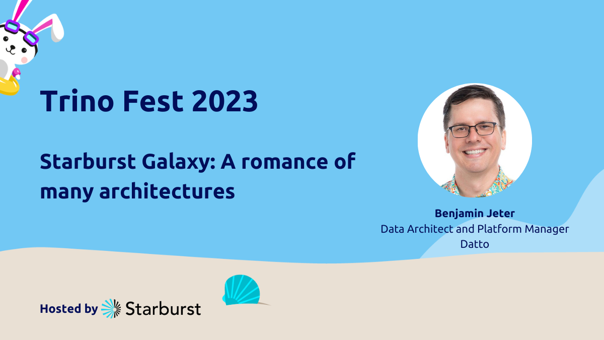 Let’s cut straight to the chase with this lightning talk from Benjamin Jeter, a data architect, platform manager, and data engineer at Datto. For those that are not familiar with Datto, they are an American cybersecurity and data backup company. They’re the leading global provider of security and cloud-based software solutions purpose-built for Managed Service Providers (MSPs). In Benjamin’s talk, he goes through some of the considerations and design goals of a reference architecture pattern that they use and why they chose to use Trino with Starburst Galaxy.