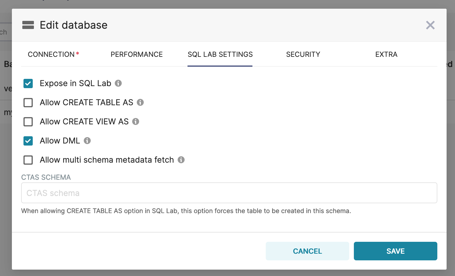 If you want to allow CTAS, CVAS, or DML operations, you’ll want to edit the Database you just created and click on the SQL LAB SETTINGS tab and select in the operations you want to allow.