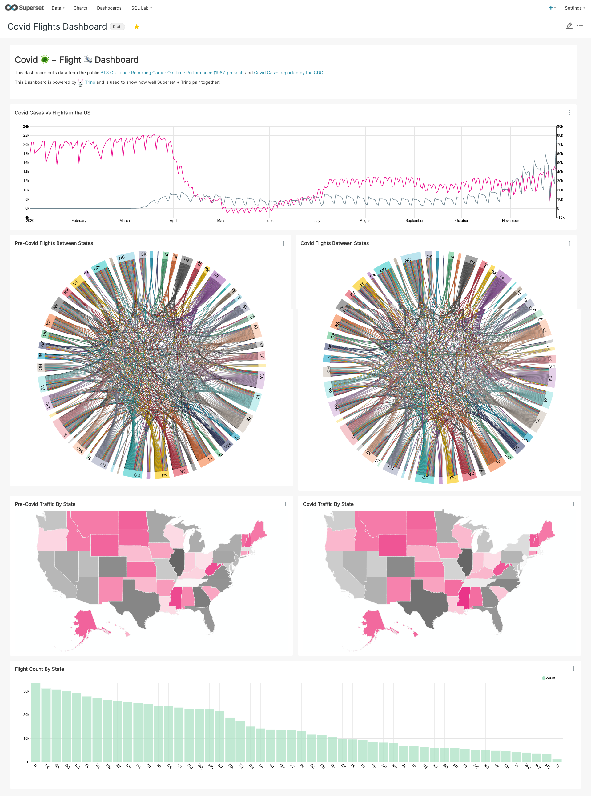 We cover adding charts and creating a dashboard in the show. We linked some blogs from Preset around how to do a lot of this workflow in great detail. Find these blogs linked below! Here’s a taste of what we created in Superset with some BTS On-Time : Reporting Carrier On-Time Performance (1987-present) and Covid Cases reported by the CDC.
