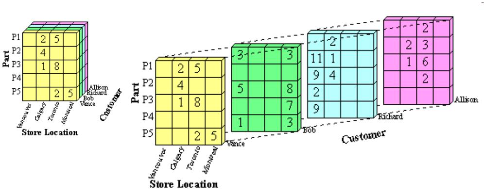 A common way to visualize the columns that are commonly bucketed to some values or range of values is to show them as a cube, that is sliced up into smaller dimensions. This actually derives from the traditional form of OLAP, multi-dimensional OLAP (MOLAP).