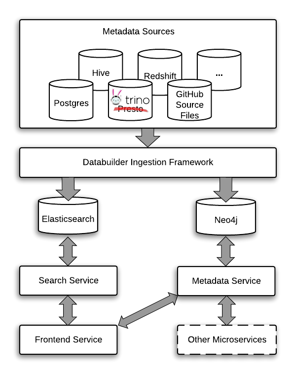 Amundsen includes an ETL framework called databuilder that runs multiple jobs. Jobs contain an ETL task to extract the metadata and load it into the two databases that are central to Amundsen, Neo4j and Elasticsearch. Neo4j stores the core metadata that is represented on the UI. Elasticsearch enables search over the many fields in the metadata. Ingestion via ETL follows the following steps: